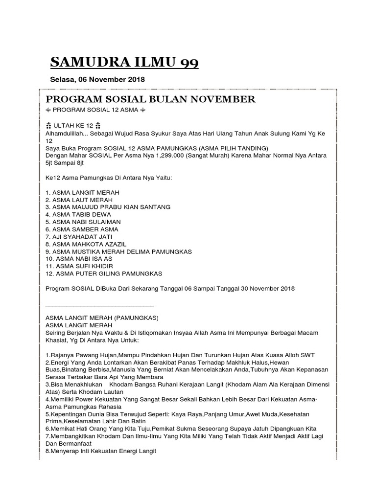 Sehingga bagi siapa saja yang memakai sabuk tersebut akan memancarkan daya aura pengasian yan sangat kuat kharisma dan wibawa tinggi sehingga siapapun yang melihat akan terpesona disenangi kawan maupun lawan. Program Pesugihan UANG ASMA PEMANGGIL UANG UANG ASMA bukanlah pesugihan yang beresiko bukan penggandaan uang bukan pesugihan uang instan bukan uang balik dan juga bukan pengambilan harta anak cucu. Ingin rezeki banyak maka bergeraklah dan berdinamika mengais rezeki.